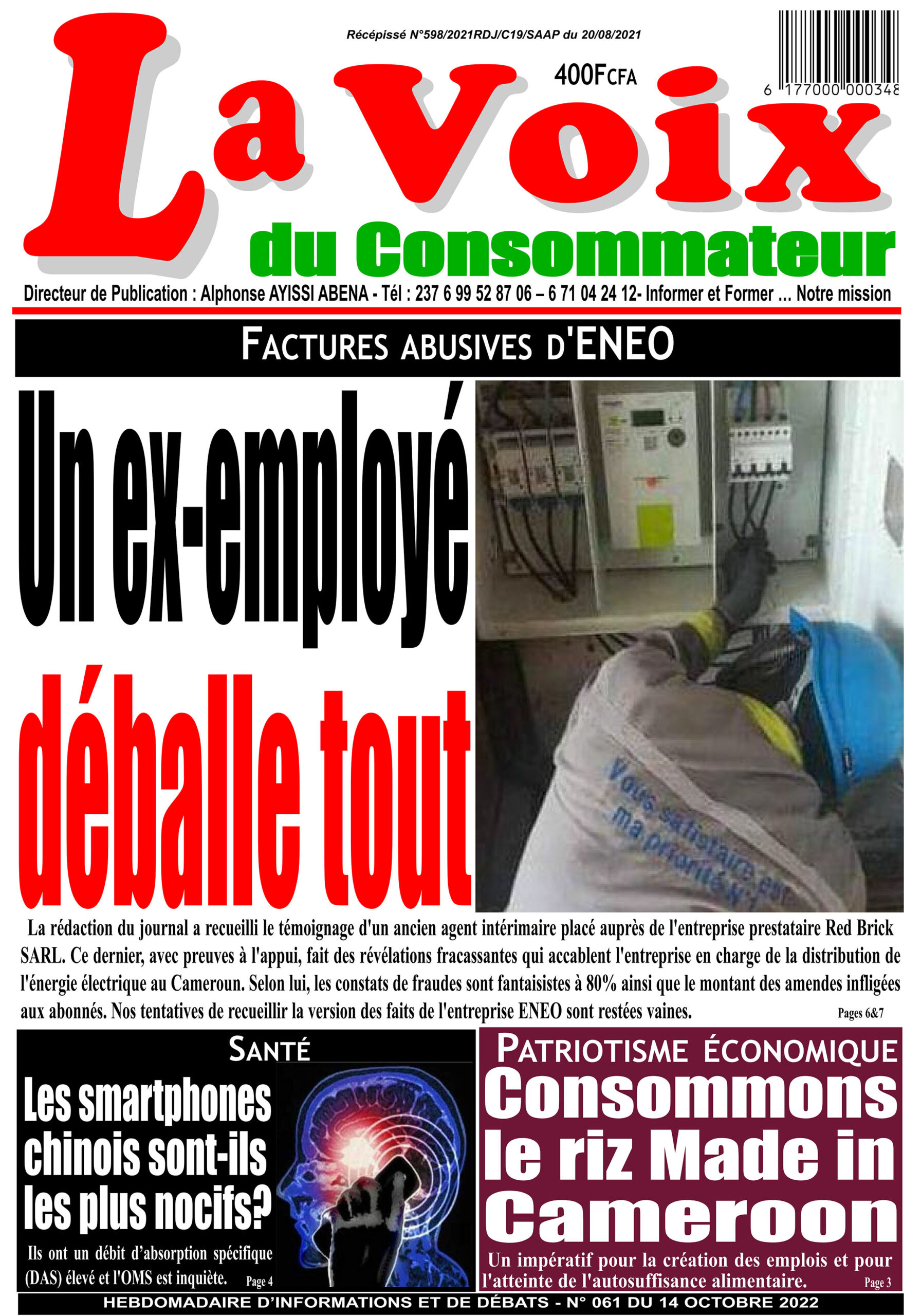 Ce dernier, avec preuves à l’appui, fait des révélations fracassantes qui accablent l’entreprise en charge de la distribution de l’énergie électrique au Cameroun. Selon lui, les constats de fraudes sont fantaisistes à 80% ainsi que le montant des amendes infligées aux abonnés. Nos tentatives de recueillir la version des faits de l’entreprise ENEO sont restées vaines.
