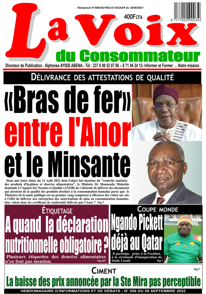Dans une lettre datée du 12 Août 2022 dont l’objet fait mention du « contrôle sanitaire des produits d’hygiènes et denrées alimentaires », le Ministre Dr Manaouda Malachie demande à l’Agence des Normes et Qualité (ANOR) de s’abstenir de délivrer des documents qui attestent de la qualité des produits destinés à la consommation humaine parce que le Ministère de la santé publique est au premier rang compétent à effectuer des visites sur site à l’effet de délivrer aux entreprises des autorisations de mise en consommation humaine. Que valent donc les certificats de conformité délivrés par l’Anor ?