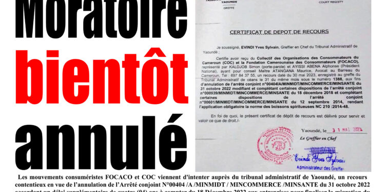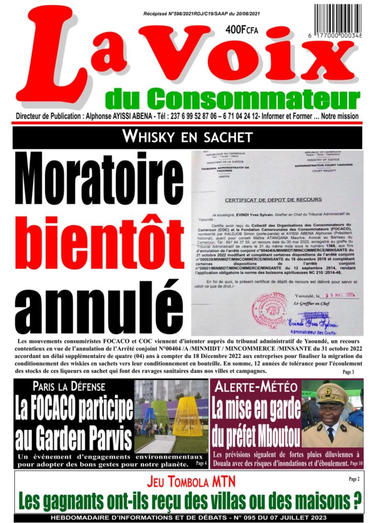 Les mouvements consuméristes FOCACO et COC viennent d’intenter auprès du tribunal administratif de Yaoundé, un recours contentieux en vue de l’annulation de l’Arrêté conjoint N°00404 /A /MINMIDT / MINCOMMERCE /MINSANTE du 31 octobre 2022 accordant un délai supplémentaire de quatre (04) ans à compter du 18 Décembre 2022 aux entreprises pour finaliser la migration du conditionnement des wiskies en sachets vers leur conditionnement en bouteille. En somme, 12 années de tolérance pour l’écoulement des stocks de ces liqueurs en sachet qui font des ravages sanitaires dans nos villes et campagnes.